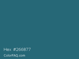 Hex #266877 Color is a normal cyan color and the nearest color is Casal #2f6168. Hex code #266877 and RGB value is rgb(38,104,119). In RGB color space, this color is composed of 15% red, 41% green, 47% blue, In CMYK color space, this color is composed of 68% cyan, 13% magenta, 0% yellow , 53% black , In HSL color space, this color has a hue angle of 191° , 52% saturation and 31% lightness.