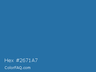 Hex #2671a7 Color is a normal blue color and the nearest color is Jelly Bean #297b9a. Hex code #2671a7 and RGB value is rgb(38,113,167). In RGB color space, this color is composed of 15% red, 44% green, 65% blue, In CMYK color space, this color is composed of 77% cyan, 32% magenta, 0% yellow , 35% black , In HSL color space, this color has a hue angle of 205° , 63% saturation and 40% lightness.