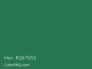 Hex #267653 Color is a normal green color and the nearest color is Dark Spring Green #177245. Hex code #267653 and RGB value is rgb(38,118,83). In RGB color space, this color is composed of 15% red, 46% green, 33% blue, In CMYK color space, this color is composed of 68% cyan, 0% magenta, 30% yellow , 54% black , In HSL color space, this color has a hue angle of 154° , 51% saturation and 31% lightness.