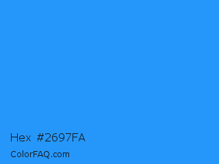 Hex #2697fa Color is a normal blue color and the nearest color is Dodger Blue #1e90ff. Hex code #2697fa and RGB value is rgb(38,151,250). In RGB color space, this color is composed of 15% red, 59% green, 98% blue, In CMYK color space, this color is composed of 85% cyan, 40% magenta, 0% yellow , 2% black , In HSL color space, this color has a hue angle of 208° , 95% saturation and 56% lightness.