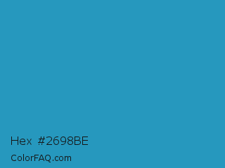 Hex #2698be Color is a normal blue color and the nearest color is Eastern Blue #1e9ab0. Hex code #2698be and RGB value is rgb(38,152,190). In RGB color space, this color is composed of 15% red, 60% green, 75% blue, In CMYK color space, this color is composed of 80% cyan, 20% magenta, 0% yellow , 25% black , In HSL color space, this color has a hue angle of 195° , 67% saturation and 45% lightness.