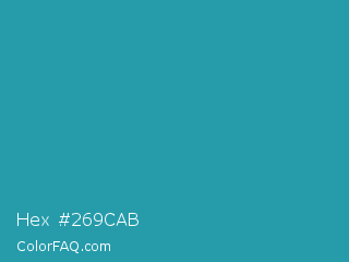 Hex #269cab Color is a normal cyan color and the nearest color is Eastern Blue #1e9ab0. Hex code #269cab and RGB value is rgb(38,156,171). In RGB color space, this color is composed of 15% red, 61% green, 67% blue, In CMYK color space, this color is composed of 78% cyan, 9% magenta, 0% yellow , 33% black , In HSL color space, this color has a hue angle of 187° , 64% saturation and 41% lightness.