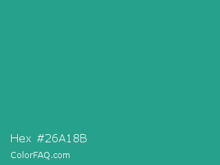 Hex #26a18b Color is a normal cyan color and the nearest color is Jungle Green #29ab87. Hex code #26a18b and RGB value is rgb(38,161,139). In RGB color space, this color is composed of 15% red, 63% green, 55% blue, In CMYK color space, this color is composed of 76% cyan, 0% magenta, 14% yellow , 37% black , In HSL color space, this color has a hue angle of 169° , 62% saturation and 39% lightness.