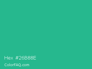 Hex #26b88e Color is a normal green color and the nearest color is Mountain Meadow #30ba8f. Hex code #26b88e and RGB value is rgb(38,184,142). In RGB color space, this color is composed of 15% red, 72% green, 56% blue, In CMYK color space, this color is composed of 79% cyan, 0% magenta, 23% yellow , 28% black , In HSL color space, this color has a hue angle of 163° , 66% saturation and 44% lightness.