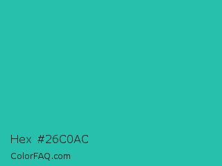 Hex #26c0ac Color is a normal cyan color and the nearest color is Light Sea Green #20b2aa. Hex code #26c0ac and RGB value is rgb(38,192,172). In RGB color space, this color is composed of 15% red, 75% green, 67% blue, In CMYK color space, this color is composed of 80% cyan, 0% magenta, 10% yellow , 25% black , In HSL color space, this color has a hue angle of 172° , 67% saturation and 45% lightness.