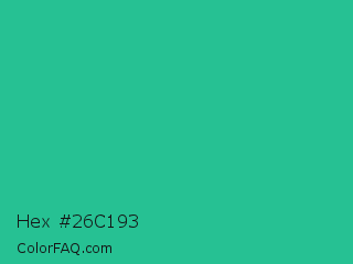 Hex #26c193 Color is a normal green color and the nearest color is Mountain Meadow #30ba8f. Hex code #26c193 and RGB value is rgb(38,193,147). In RGB color space, this color is composed of 15% red, 76% green, 58% blue, In CMYK color space, this color is composed of 80% cyan, 0% magenta, 24% yellow , 24% black , In HSL color space, this color has a hue angle of 162° , 67% saturation and 45% lightness.