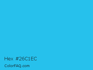 Hex #26c1ec Color is a normal cyan color and the nearest color is Scooter #2ebfd4. Hex code #26c1ec and RGB value is rgb(38,193,236). In RGB color space, this color is composed of 15% red, 76% green, 93% blue, In CMYK color space, this color is composed of 84% cyan, 18% magenta, 0% yellow , 7% black , In HSL color space, this color has a hue angle of 193° , 84% saturation and 54% lightness.