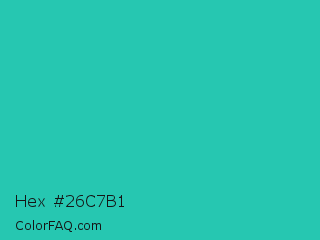 Hex #26c7b1 Color is a normal cyan color and the nearest color is Maximum Blue Green #30bfbf. Hex code #26c7b1 and RGB value is rgb(38,199,177). In RGB color space, this color is composed of 15% red, 78% green, 69% blue, In CMYK color space, this color is composed of 81% cyan, 0% magenta, 11% yellow , 22% black , In HSL color space, this color has a hue angle of 172° , 68% saturation and 46% lightness.