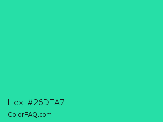 Hex #26dfa7 Color is a normal green color and the nearest color is Shamrock #33cc99. Hex code #26dfa7 and RGB value is rgb(38,223,167). In RGB color space, this color is composed of 15% red, 87% green, 65% blue, In CMYK color space, this color is composed of 83% cyan, 0% magenta, 25% yellow , 13% black , In HSL color space, this color has a hue angle of 162° , 74% saturation and 51% lightness.