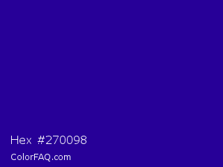 Hex #270098 Color is a dark indigo color and the nearest color is Blue Gem #2c0e8c. Hex code #270098 and RGB value is rgb(39,0,152). In RGB color space, this color is composed of 15% red, 0% green, 60% blue, In CMYK color space, this color is composed of 74% cyan, 100% magenta, 0% yellow , 40% black , In HSL color space, this color has a hue angle of 255° , 100% saturation and 30% lightness.