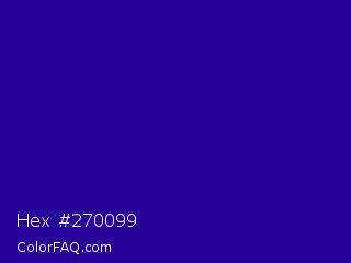 Hex #270099 Color is a dark indigo color and the nearest color is Blue Gem #2c0e8c. Hex code #270099 and RGB value is rgb(39,0,153). In RGB color space, this color is composed of 15% red, 0% green, 60% blue, In CMYK color space, this color is composed of 75% cyan, 100% magenta, 0% yellow , 40% black , In HSL color space, this color has a hue angle of 255° , 100% saturation and 30% lightness.