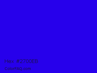 Hex #2700eb Color is a normal indigo color and the nearest color is Bluebonnet #1c1cf0. Hex code #2700eb and RGB value is rgb(39,0,235). In RGB color space, this color is composed of 15% red, 0% green, 92% blue, In CMYK color space, this color is composed of 83% cyan, 100% magenta, 0% yellow , 8% black , In HSL color space, this color has a hue angle of 250° , 100% saturation and 46% lightness.