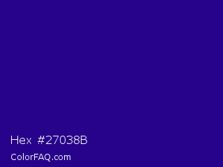 Hex #27038b Color is a dark indigo color and the nearest color is Blue Gem #2c0e8c. Hex code #27038b and RGB value is rgb(39,3,139). In RGB color space, this color is composed of 15% red, 1% green, 55% blue, In CMYK color space, this color is composed of 72% cyan, 98% magenta, 0% yellow , 45% black , In HSL color space, this color has a hue angle of 256° , 96% saturation and 28% lightness.