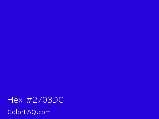 Hex #2703dc Color is a normal indigo color and the nearest color is Interdimensional Blue #360ccc. Hex code #2703dc and RGB value is rgb(39,3,220). In RGB color space, this color is composed of 15% red, 1% green, 86% blue, In CMYK color space, this color is composed of 82% cyan, 99% magenta, 0% yellow , 14% black , In HSL color space, this color has a hue angle of 250° , 97% saturation and 44% lightness.