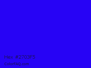 Hex #2703f5 Color is a normal indigo color and the nearest color is Electric Ultramarine #3f00ff. Hex code #2703f5 and RGB value is rgb(39,3,245). In RGB color space, this color is composed of 15% red, 1% green, 96% blue, In CMYK color space, this color is composed of 84% cyan, 99% magenta, 0% yellow , 4% black , In HSL color space, this color has a hue angle of 249° , 98% saturation and 49% lightness.