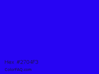 Hex #2704f3 Color is a normal indigo color and the nearest color is Bluebonnet #1c1cf0. Hex code #2704f3 and RGB value is rgb(39,4,243). In RGB color space, this color is composed of 15% red, 2% green, 95% blue, In CMYK color space, this color is composed of 84% cyan, 98% magenta, 0% yellow , 5% black , In HSL color space, this color has a hue angle of 249° , 97% saturation and 48% lightness.