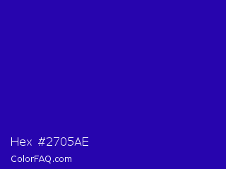 Hex #2705ae Color is a normal indigo color and the nearest color is Interdimensional Blue #360ccc. Hex code #2705ae and RGB value is rgb(39,5,174). In RGB color space, this color is composed of 15% red, 2% green, 68% blue, In CMYK color space, this color is composed of 78% cyan, 97% magenta, 0% yellow , 32% black , In HSL color space, this color has a hue angle of 252° , 94% saturation and 35% lightness.