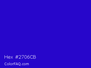 Hex #2706cb Color is a normal indigo color and the nearest color is Interdimensional Blue #360ccc. Hex code #2706cb and RGB value is rgb(39,6,203). In RGB color space, this color is composed of 15% red, 2% green, 80% blue, In CMYK color space, this color is composed of 81% cyan, 97% magenta, 0% yellow , 20% black , In HSL color space, this color has a hue angle of 250° , 94% saturation and 41% lightness.
