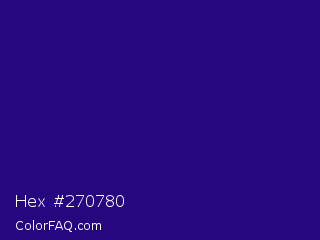 Hex #270780 Color is a dark indigo color and the nearest color is Deep Blue #220878. Hex code #270780 and RGB value is rgb(39,7,128). In RGB color space, this color is composed of 15% red, 3% green, 50% blue, In CMYK color space, this color is composed of 70% cyan, 95% magenta, 0% yellow , 50% black , In HSL color space, this color has a hue angle of 256° , 90% saturation and 26% lightness.