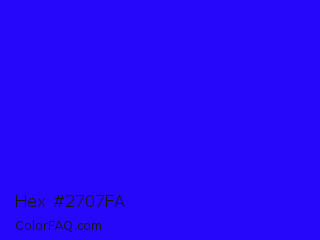 Hex #2707fa Color is a normal indigo color and the nearest color is Electric Ultramarine #3f00ff. Hex code #2707fa and RGB value is rgb(39,7,250). In RGB color space, this color is composed of 15% red, 3% green, 98% blue, In CMYK color space, this color is composed of 84% cyan, 97% magenta, 0% yellow , 2% black , In HSL color space, this color has a hue angle of 248° , 96% saturation and 50% lightness.