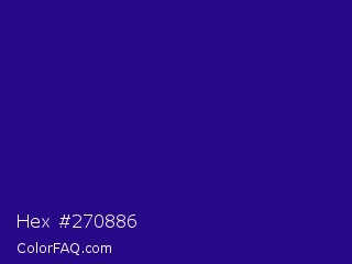 Hex #270886 Color is a dark indigo color and the nearest color is Blue Gem #2c0e8c. Hex code #270886 and RGB value is rgb(39,8,134). In RGB color space, this color is composed of 15% red, 3% green, 53% blue, In CMYK color space, this color is composed of 71% cyan, 94% magenta, 0% yellow , 47% black , In HSL color space, this color has a hue angle of 255° , 89% saturation and 28% lightness.