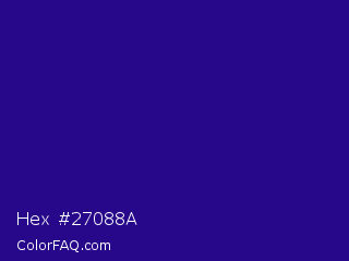 Hex #27088a Color is a dark indigo color and the nearest color is Blue Gem #2c0e8c. Hex code #27088a and RGB value is rgb(39,8,138). In RGB color space, this color is composed of 15% red, 3% green, 54% blue, In CMYK color space, this color is composed of 72% cyan, 94% magenta, 0% yellow , 46% black , In HSL color space, this color has a hue angle of 254° , 89% saturation and 29% lightness.