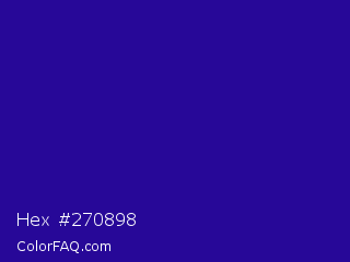 Hex #270898 Color is a normal indigo color and the nearest color is Blue Gem #2c0e8c. Hex code #270898 and RGB value is rgb(39,8,152). In RGB color space, this color is composed of 15% red, 3% green, 60% blue, In CMYK color space, this color is composed of 74% cyan, 95% magenta, 0% yellow , 40% black , In HSL color space, this color has a hue angle of 253° , 90% saturation and 31% lightness.