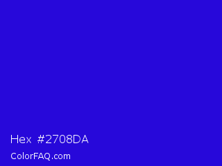 Hex #2708da Color is a normal indigo color and the nearest color is Interdimensional Blue #360ccc. Hex code #2708da and RGB value is rgb(39,8,218). In RGB color space, this color is composed of 15% red, 3% green, 85% blue, In CMYK color space, this color is composed of 82% cyan, 96% magenta, 0% yellow , 15% black , In HSL color space, this color has a hue angle of 249° , 93% saturation and 44% lightness.