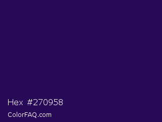 Hex #270958 Color is a very dark violet color and the nearest color is Cherry Pie #2a0359. Hex code #270958 and RGB value is rgb(39,9,88). In RGB color space, this color is composed of 15% red, 4% green, 35% blue, In CMYK color space, this color is composed of 56% cyan, 90% magenta, 0% yellow , 65% black , In HSL color space, this color has a hue angle of 263° , 81% saturation and 19% lightness.