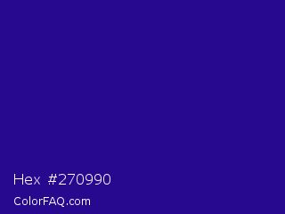 Hex #270990 Color is a dark indigo color and the nearest color is Blue Gem #2c0e8c. Hex code #270990 and RGB value is rgb(39,9,144). In RGB color space, this color is composed of 15% red, 4% green, 56% blue, In CMYK color space, this color is composed of 73% cyan, 94% magenta, 0% yellow , 44% black , In HSL color space, this color has a hue angle of 253° , 88% saturation and 30% lightness.