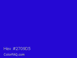 Hex #2709d5 Color is a normal indigo color and the nearest color is Interdimensional Blue #360ccc. Hex code #2709d5 and RGB value is rgb(39,9,213). In RGB color space, this color is composed of 15% red, 4% green, 84% blue, In CMYK color space, this color is composed of 82% cyan, 96% magenta, 0% yellow , 16% black , In HSL color space, this color has a hue angle of 249° , 92% saturation and 44% lightness.