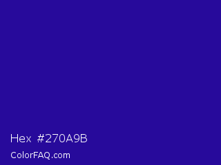 Hex #270a9b Color is a normal indigo color and the nearest color is Blue Gem #2c0e8c. Hex code #270a9b and RGB value is rgb(39,10,155). In RGB color space, this color is composed of 15% red, 4% green, 61% blue, In CMYK color space, this color is composed of 75% cyan, 94% magenta, 0% yellow , 39% black , In HSL color space, this color has a hue angle of 252° , 88% saturation and 32% lightness.