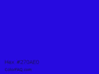Hex #270ae0 Color is a normal indigo color and the nearest color is Interdimensional Blue #360ccc. Hex code #270ae0 and RGB value is rgb(39,10,224). In RGB color space, this color is composed of 15% red, 4% green, 88% blue, In CMYK color space, this color is composed of 83% cyan, 96% magenta, 0% yellow , 12% black , In HSL color space, this color has a hue angle of 248° , 91% saturation and 46% lightness.