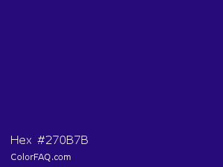 Hex #270b7b Color is a dark indigo color and the nearest color is Deep Blue #220878. Hex code #270b7b and RGB value is rgb(39,11,123). In RGB color space, this color is composed of 15% red, 4% green, 48% blue, In CMYK color space, this color is composed of 68% cyan, 91% magenta, 0% yellow , 52% black , In HSL color space, this color has a hue angle of 255° , 84% saturation and 26% lightness.
