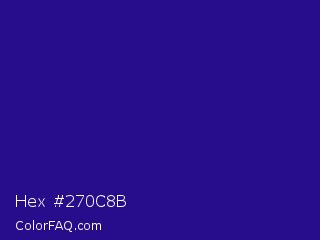 Hex #270c8b Color is a dark indigo color and the nearest color is Blue Gem #2c0e8c. Hex code #270c8b and RGB value is rgb(39,12,139). In RGB color space, this color is composed of 15% red, 5% green, 55% blue, In CMYK color space, this color is composed of 72% cyan, 91% magenta, 0% yellow , 45% black , In HSL color space, this color has a hue angle of 253° , 84% saturation and 30% lightness.