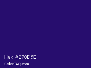 Hex #270d6e Color is a dark indigo color and the nearest color is Paris M #26056a. Hex code #270d6e and RGB value is rgb(39,13,110). In RGB color space, this color is composed of 15% red, 5% green, 43% blue, In CMYK color space, this color is composed of 65% cyan, 88% magenta, 0% yellow , 57% black , In HSL color space, this color has a hue angle of 256° , 79% saturation and 24% lightness.