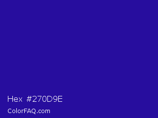 Hex #270d9e Color is a normal indigo color and the nearest color is Blue Gem #2c0e8c. Hex code #270d9e and RGB value is rgb(39,13,158). In RGB color space, this color is composed of 15% red, 5% green, 62% blue, In CMYK color space, this color is composed of 75% cyan, 92% magenta, 0% yellow , 38% black , In HSL color space, this color has a hue angle of 251° , 85% saturation and 34% lightness.