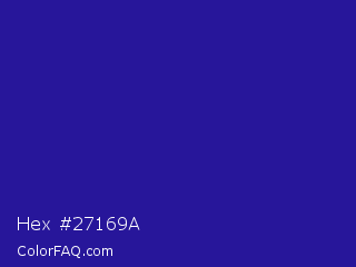 Hex #27169a Color is a normal indigo color and the nearest color is Blue Gem #2c0e8c. Hex code #27169a and RGB value is rgb(39,22,154). In RGB color space, this color is composed of 15% red, 9% green, 60% blue, In CMYK color space, this color is composed of 75% cyan, 86% magenta, 0% yellow , 40% black , In HSL color space, this color has a hue angle of 248° , 75% saturation and 35% lightness.