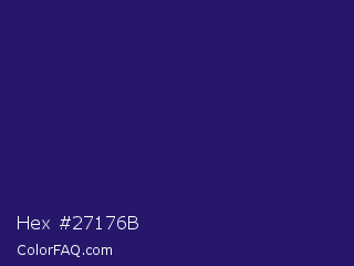 Hex #27176b Color is a dark indigo color and the nearest color is Lucky Point #1a1a68. Hex code #27176b and RGB value is rgb(39,23,107). In RGB color space, this color is composed of 15% red, 9% green, 42% blue, In CMYK color space, this color is composed of 64% cyan, 79% magenta, 0% yellow , 58% black , In HSL color space, this color has a hue angle of 251° , 65% saturation and 25% lightness.