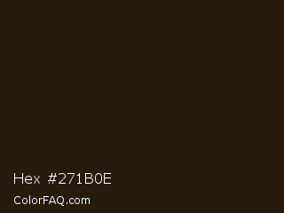 Hex #271b0e Color is a very dark orange color and the nearest color is Eternity #211a0e. Hex code #271b0e and RGB value is rgb(39,27,14). In RGB color space, this color is composed of 15% red, 11% green, 5% blue, In CMYK color space, this color is composed of 0% cyan, 31% magenta, 64% yellow , 85% black , In HSL color space, this color has a hue angle of 31° , 47% saturation and 10% lightness.