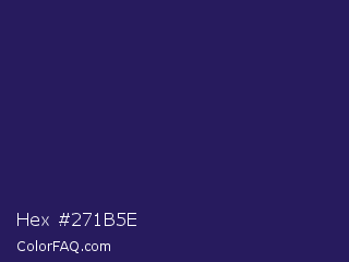 Hex #271b5e Color is a dark indigo color and the nearest color is Violent Violet #290c5e. Hex code #271b5e and RGB value is rgb(39,27,94). In RGB color space, this color is composed of 15% red, 11% green, 37% blue, In CMYK color space, this color is composed of 59% cyan, 71% magenta, 0% yellow , 63% black , In HSL color space, this color has a hue angle of 251° , 55% saturation and 24% lightness.