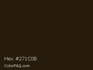 Hex #271c0b Color is a very dark orange color and the nearest color is Eternity #211a0e. Hex code #271c0b and RGB value is rgb(39,28,11). In RGB color space, this color is composed of 15% red, 11% green, 4% blue, In CMYK color space, this color is composed of 0% cyan, 28% magenta, 72% yellow , 85% black , In HSL color space, this color has a hue angle of 36° , 56% saturation and 10% lightness.