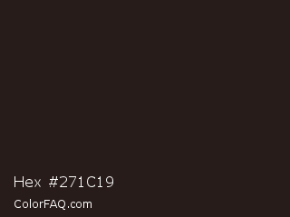 Hex #271c19 Color is a very dark red color and the nearest color is Oil #281e15. Hex code #271c19 and RGB value is rgb(39,28,25). In RGB color space, this color is composed of 15% red, 11% green, 10% blue, In CMYK color space, this color is composed of 0% cyan, 28% magenta, 36% yellow , 85% black , In HSL color space, this color has a hue angle of 13° , 22% saturation and 13% lightness.