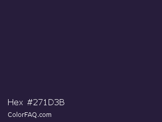 Hex #271d3b Color is a very dark indigo color and the nearest color is Steel Gray #262335. Hex code #271d3b and RGB value is rgb(39,29,59). In RGB color space, this color is composed of 15% red, 11% green, 23% blue, In CMYK color space, this color is composed of 34% cyan, 51% magenta, 0% yellow , 77% black , In HSL color space, this color has a hue angle of 260° , 34% saturation and 17% lightness.
