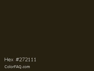 Hex #272111 Color is a very dark orange color and the nearest color is Oil #281e15. Hex code #272111 and RGB value is rgb(39,33,17). In RGB color space, this color is composed of 15% red, 13% green, 7% blue, In CMYK color space, this color is composed of 0% cyan, 15% magenta, 56% yellow , 85% black , In HSL color space, this color has a hue angle of 44° , 39% saturation and 11% lightness.