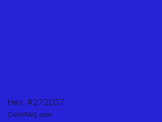Hex #2721d7 Color is a normal indigo color and the nearest color is Bluebonnet #1c1cf0. Hex code #2721d7 and RGB value is rgb(39,33,215). In RGB color space, this color is composed of 15% red, 13% green, 84% blue, In CMYK color space, this color is composed of 82% cyan, 85% magenta, 0% yellow , 16% black , In HSL color space, this color has a hue angle of 242° , 73% saturation and 49% lightness.