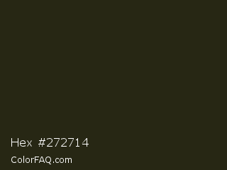 Hex #272714 Color is a very dark yellow color and the nearest color is Zeus #292319. Hex code #272714 and RGB value is rgb(39,39,20). In RGB color space, this color is composed of 15% red, 15% green, 8% blue, In CMYK color space, this color is composed of 0% cyan, 0% magenta, 49% yellow , 85% black , In HSL color space, this color has a hue angle of 60° , 32% saturation and 12% lightness.
