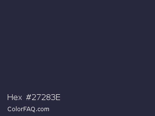 Hex #27283e Color is a very dark blue color and the nearest color is Ebony Clay #26283b. Hex code #27283e and RGB value is rgb(39,40,62). In RGB color space, this color is composed of 15% red, 16% green, 24% blue, In CMYK color space, this color is composed of 37% cyan, 35% magenta, 0% yellow , 76% black , In HSL color space, this color has a hue angle of 237° , 23% saturation and 20% lightness.