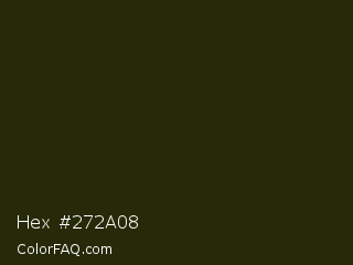 Hex #272a08 Color is a very dark yellow color and the nearest color is Onion #2f270e. Hex code #272a08 and RGB value is rgb(39,42,8). In RGB color space, this color is composed of 15% red, 16% green, 3% blue, In CMYK color space, this color is composed of 7% cyan, 0% magenta, 81% yellow , 84% black , In HSL color space, this color has a hue angle of 65° , 68% saturation and 10% lightness.