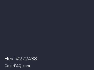 Hex #272a38 Color is a very dark blue color and the nearest color is Charade #292937. Hex code #272a38 and RGB value is rgb(39,42,56). In RGB color space, this color is composed of 15% red, 16% green, 22% blue, In CMYK color space, this color is composed of 30% cyan, 25% magenta, 0% yellow , 78% black , In HSL color space, this color has a hue angle of 229° , 18% saturation and 19% lightness.